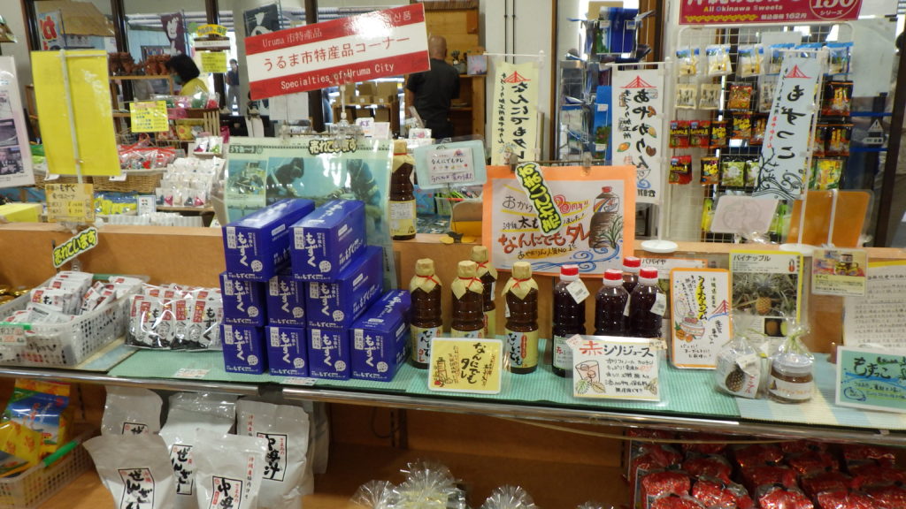 うるま市特産品コーナーでは、もずくスープや赤シソジュース、パイナップルを使ったうるまんまジャムなどが並んでいました。