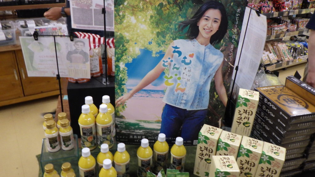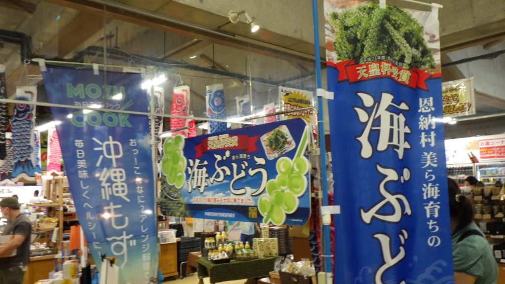 店内の特産物・お土産品コーナーでは、海ぶどうや沖縄もずく、そしてちむどんどんで話題のシークヮーサーなども数多く並んでいます。