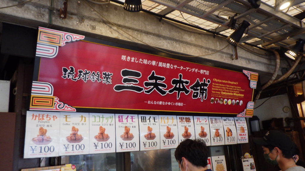 こちら、三矢本舗のサーターアンダーギーは1個100円でいろんな味を楽しむことができます。
