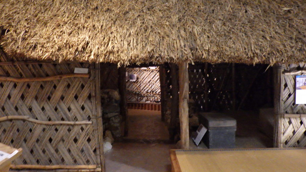 かやぶきの民家やその時代に使用されていた民具が再現されていたり、