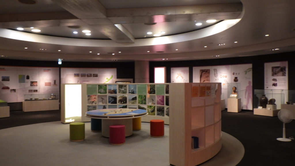 1階の展示室は丸型の展示で、1周回っていく中で、読谷の歴史やその時代で活躍した人や世界遺産の座喜味城址の歴史や構造などについて学ぶことができるようになっていました。