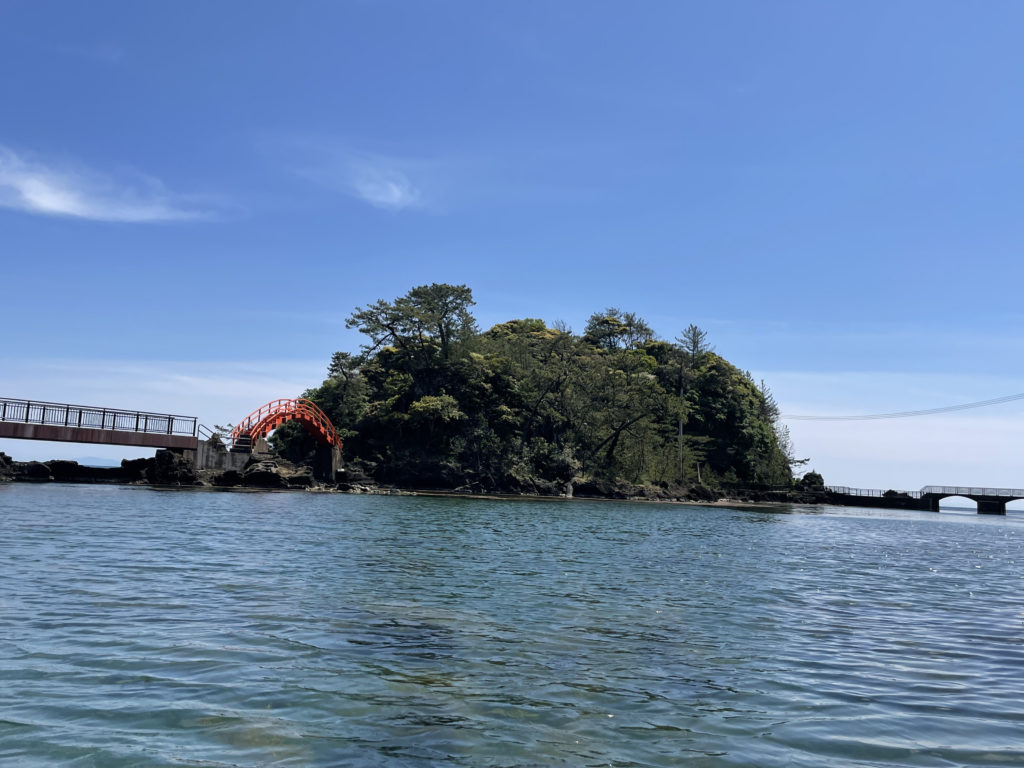 奥の方に赤い橋が見えますが、そこの奥にあるのが経島と矢島です。