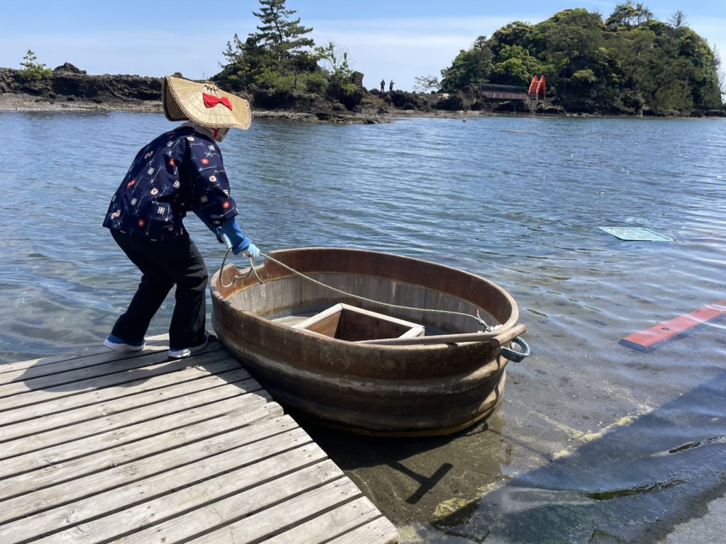 穏やかな入り江の中をスタッフさんと一緒にたらい舟で移動できます。