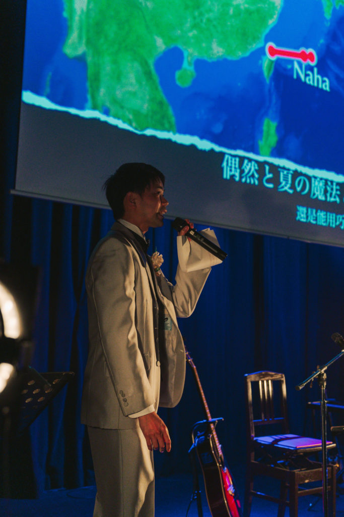 「僕らの出会いは、Anlyという伊江島出身のSSWが台湾でライブをする際一緒に行ったのがきっかけでした。そんな僕らを繋いでくれたキューピットとも言えるAnlyさんの楽曲から『だから』という曲を披露したいと思います。」と曲振りをすると、会場から自然と拍手が起こった。