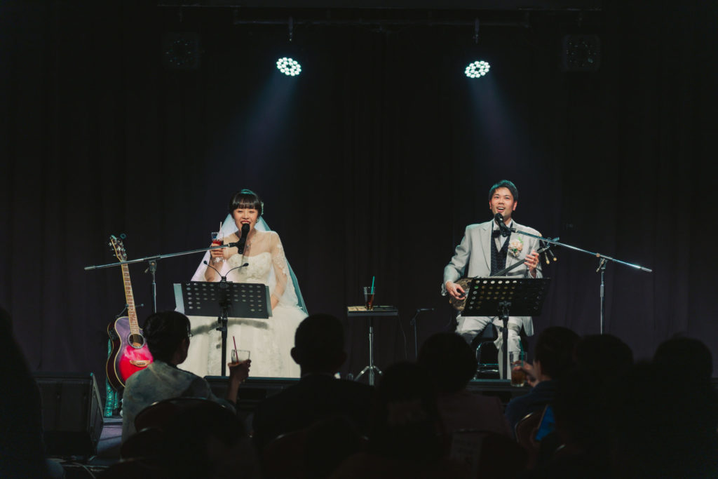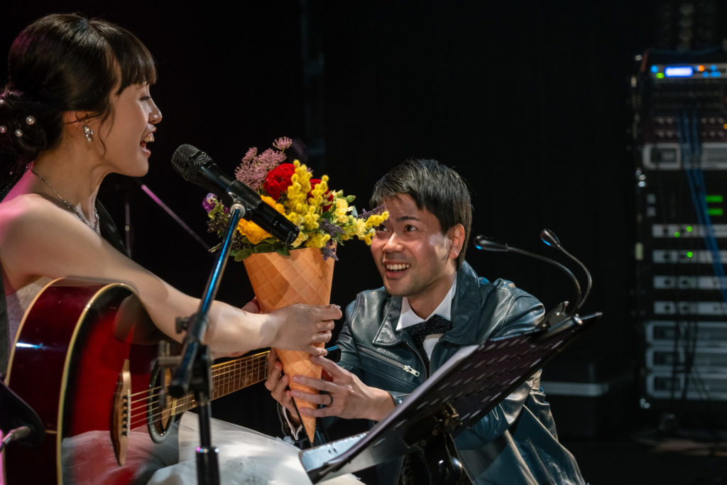 新郎てんしょうと新婦はなによる企画ライブで、共通の趣味である音楽を通して出会った2人が、