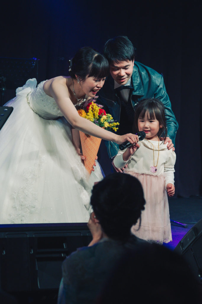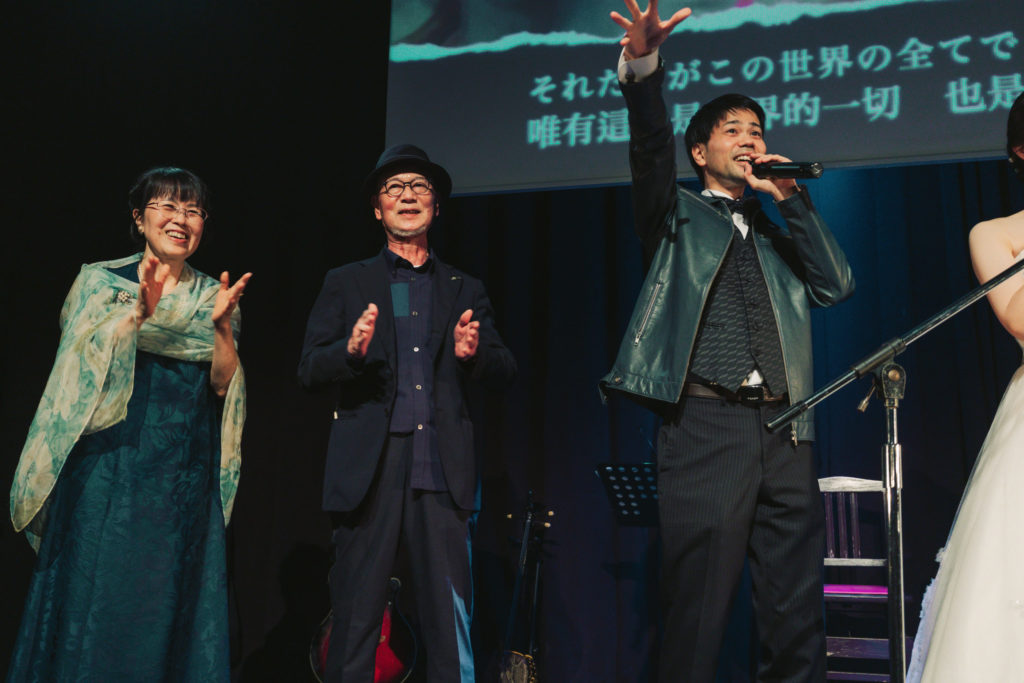 「生まれ育った場所は文化が 別々だから素晴らしいのさ 出会えた奇跡を讃えよう それこそが宝物」など、国際結婚にぴったりな歌詞もあり、音楽を通して表現することができた。ゲストの手拍子も重なり会場に一体感が生まれた瞬間だった。