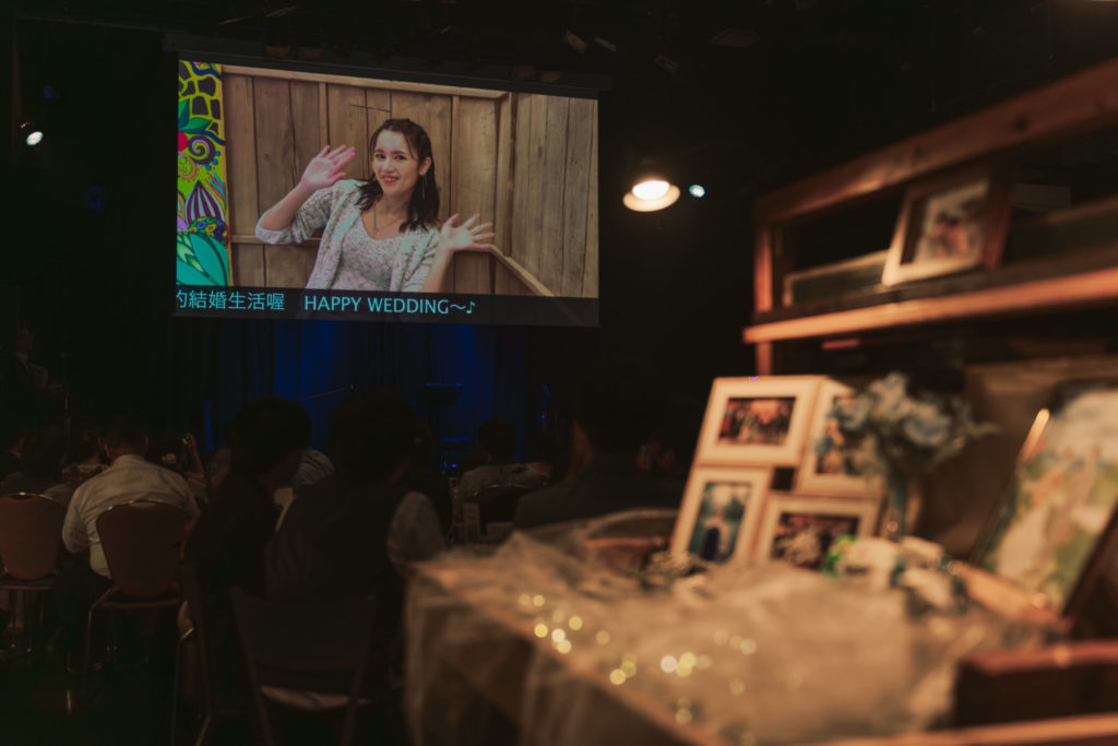 back numberの『高嶺の花子さん』の楽曲に合わせ、2人が初めて出会った頃の、back numberのMV撮影地巡りや、Anly台湾公演の思い出の写真が映し出された。イントロに合わせて新郎がエアーギターをするシーンでは、会場が笑いに包まれた。サビに入ったタイミングで新郎が「会いたいんだ 今すぐ その角から飛び出してきてくれないか」と歌い始めると、自然と手拍子が始まり会場が一つとなり、温かい空気に包まれた。ムービーの終わりに新婦手書きのイラストロゴが映し出されると、会場から大きな拍手が湧き起こり、その日を待ち侘びるみんなの想いがひしひしと伝わってくる。